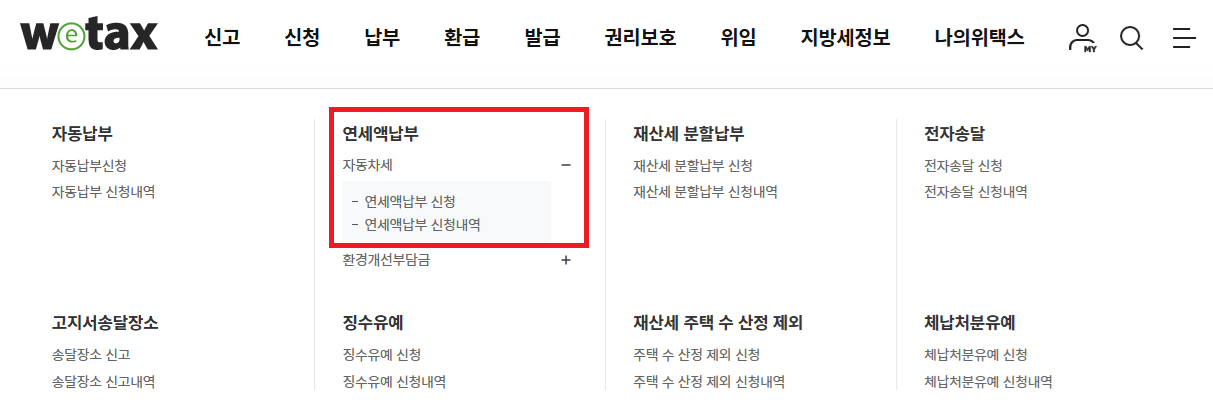- [신청 → 연세액납부 → 자동차세] 메뉴 선택